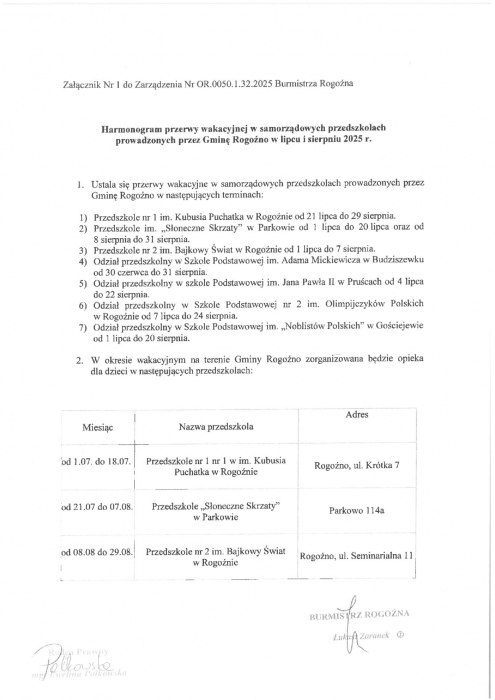 Zarządzenie Nr OR0050.1.32.2025 Burmistrza Rogoźna z dnia 4 lutego 2025 r. W sprawie opieki wakacyjnej w przedszkolach dla których organem prowadzącym jest Gmina Rogoźno.