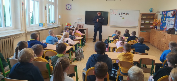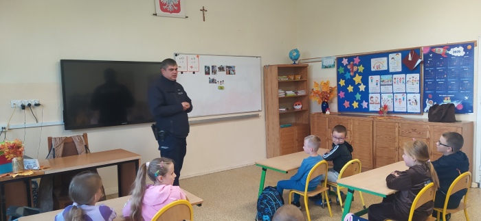 W piątek, 26 września, uczniowie klas I–III naszej szkoły uczestniczyli w spotkaniu z funkcjonariuszem Policji, który przybliżył dzieciom zasady bezpiecznego poruszania się po drogach.
