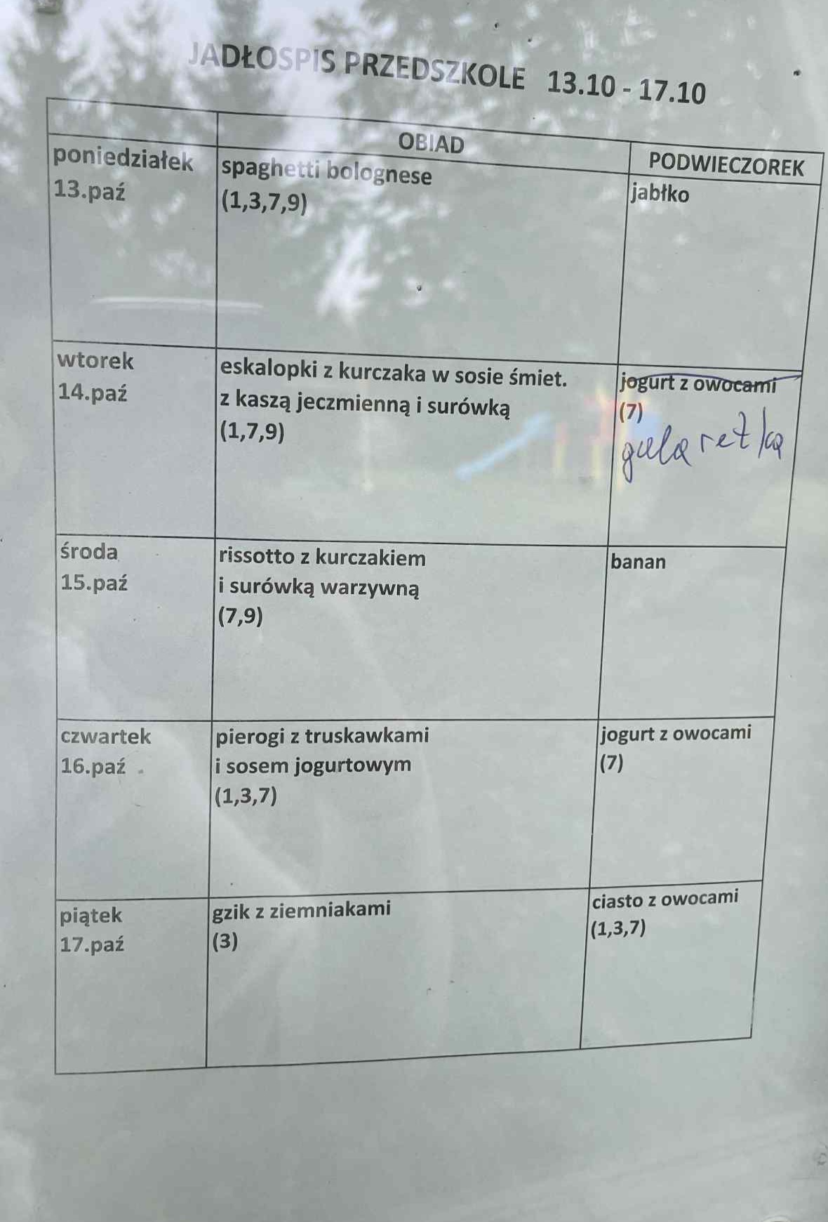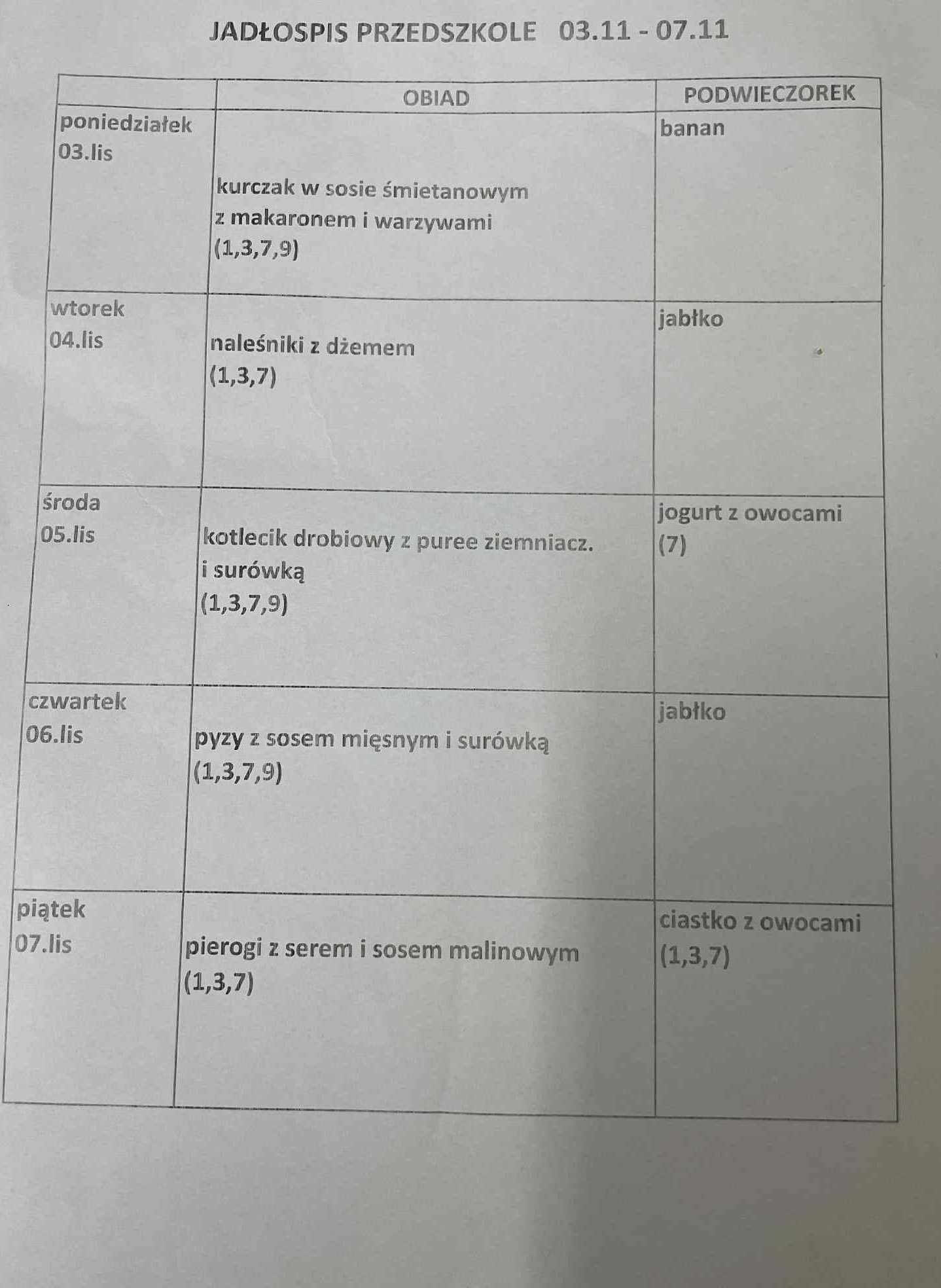 Oddział Przedszkolny – wariant I (Menu zmienne co tydzień) – koszt 8 zł